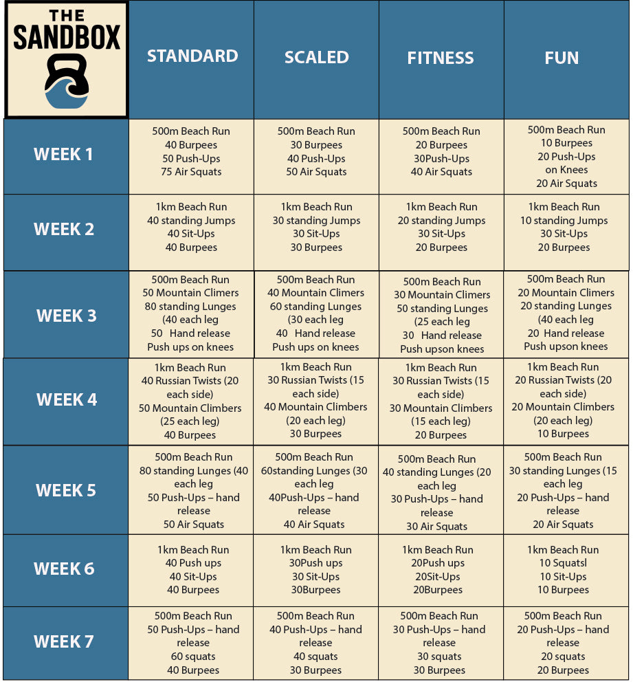 Each week you will have a workout that will be timed based. We will have all participants in a ''boxed'' area either on the sand or on the grass depending on the tides.